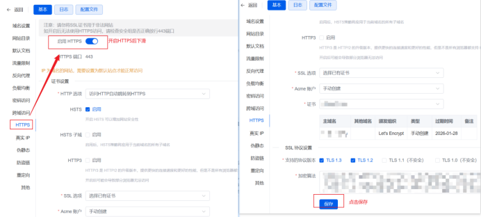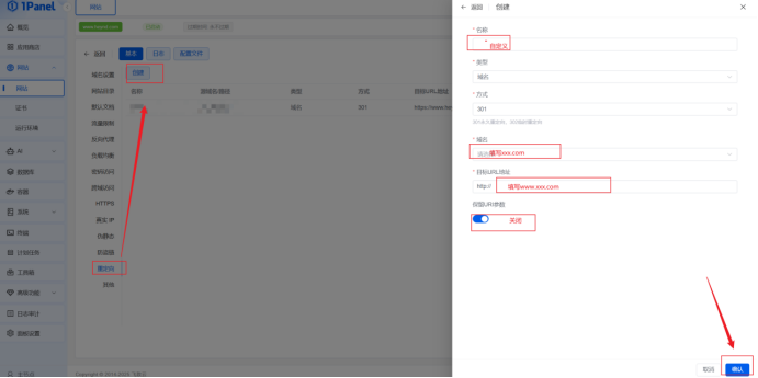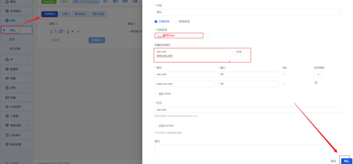 选择网站创建网站后,选择halo,填入www.xxx.com以及xxx.com后点击确认完成创建,打开配置填写名称,域名,URL地址,关闭保留URL参数后点击确认,再点击https开启https后下滑到最下面点击保存。