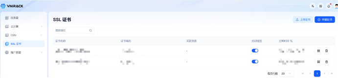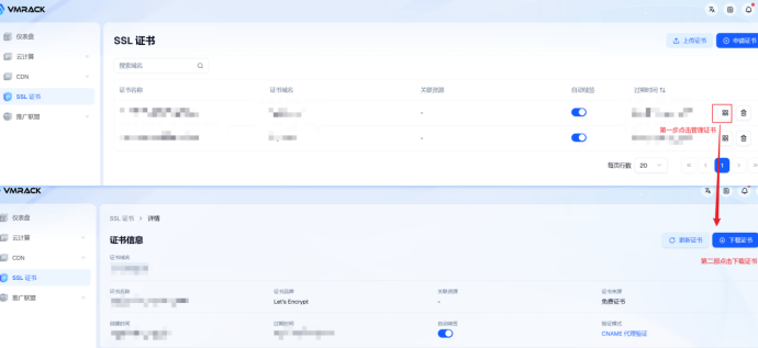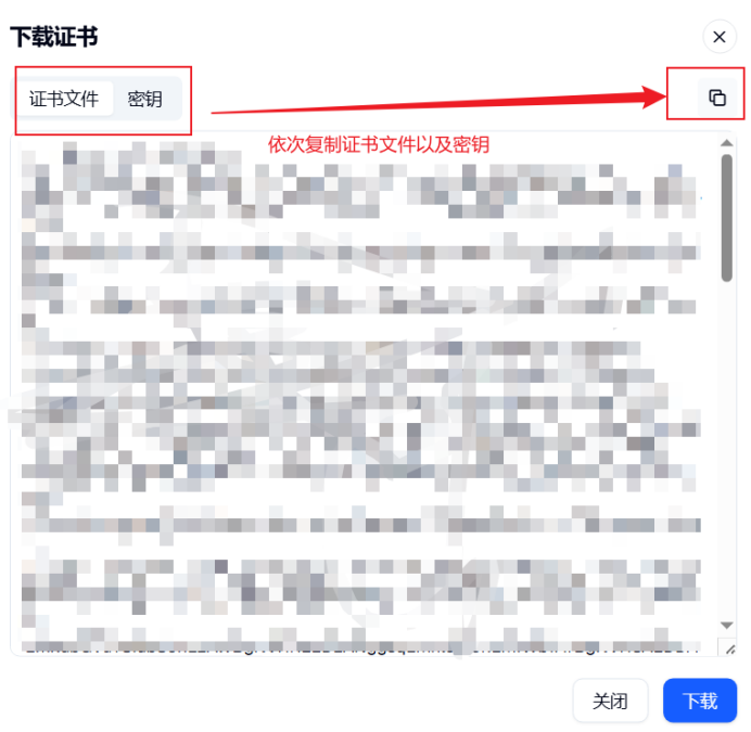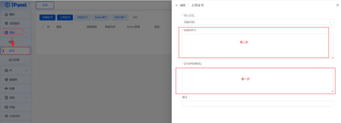 依次复制证书文件以及密钥,粘贴进入1Panel后进行上传确认,证书就上传完毕,我们要找到网站里面的证书,点击上传证书,把要上传证书和私钥复制进去后点击确认。