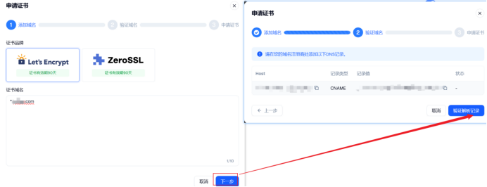接下来我们需要打开我们的服务器点击右上角的申请证书,输入*.xxxx.com(自己的域名)后点击下一步进行解析