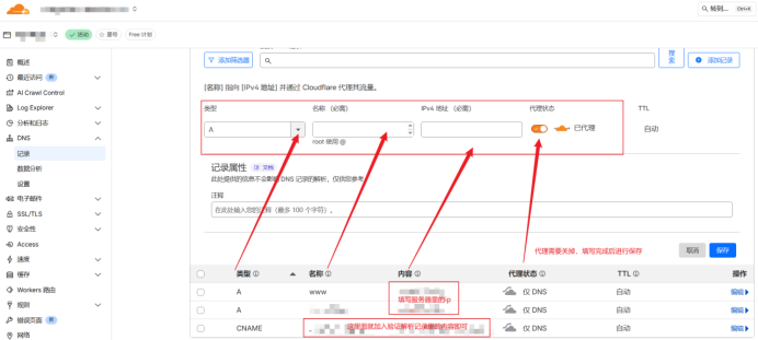 然后打开cloudflare,点击DNS里的记录,填写对应记录一个www以及xxx.com域名,和解析记录里的名称:Host(复制的时候把你的.xxx.com去掉),以及内容:记录值,等待证书通过。