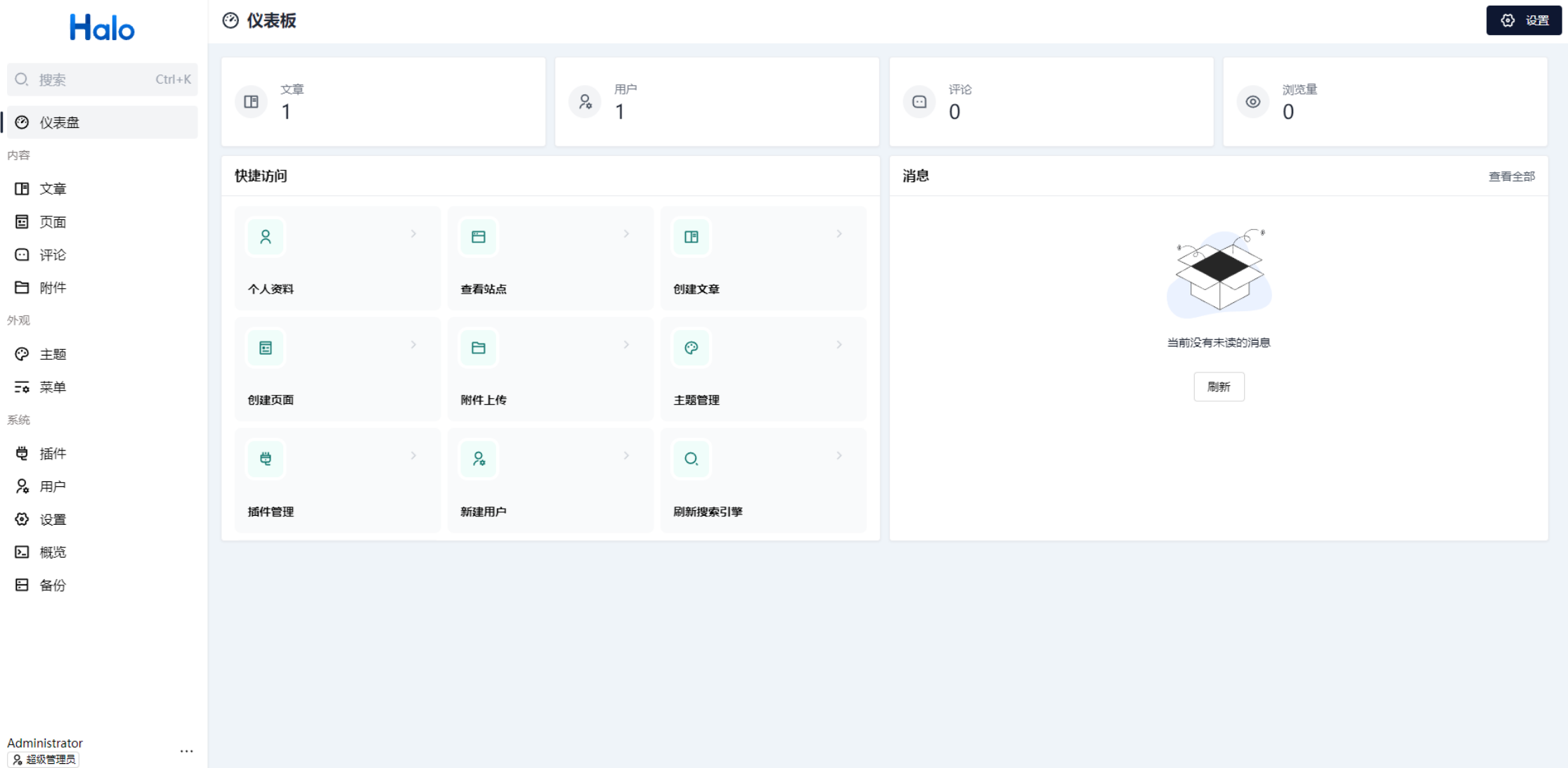 Halo 安装完成后,系统会默认生成一篇 “Hello Halo” 示例文章。接下来,我们就可以开始创建并发布属于自己的第一篇文章了。
